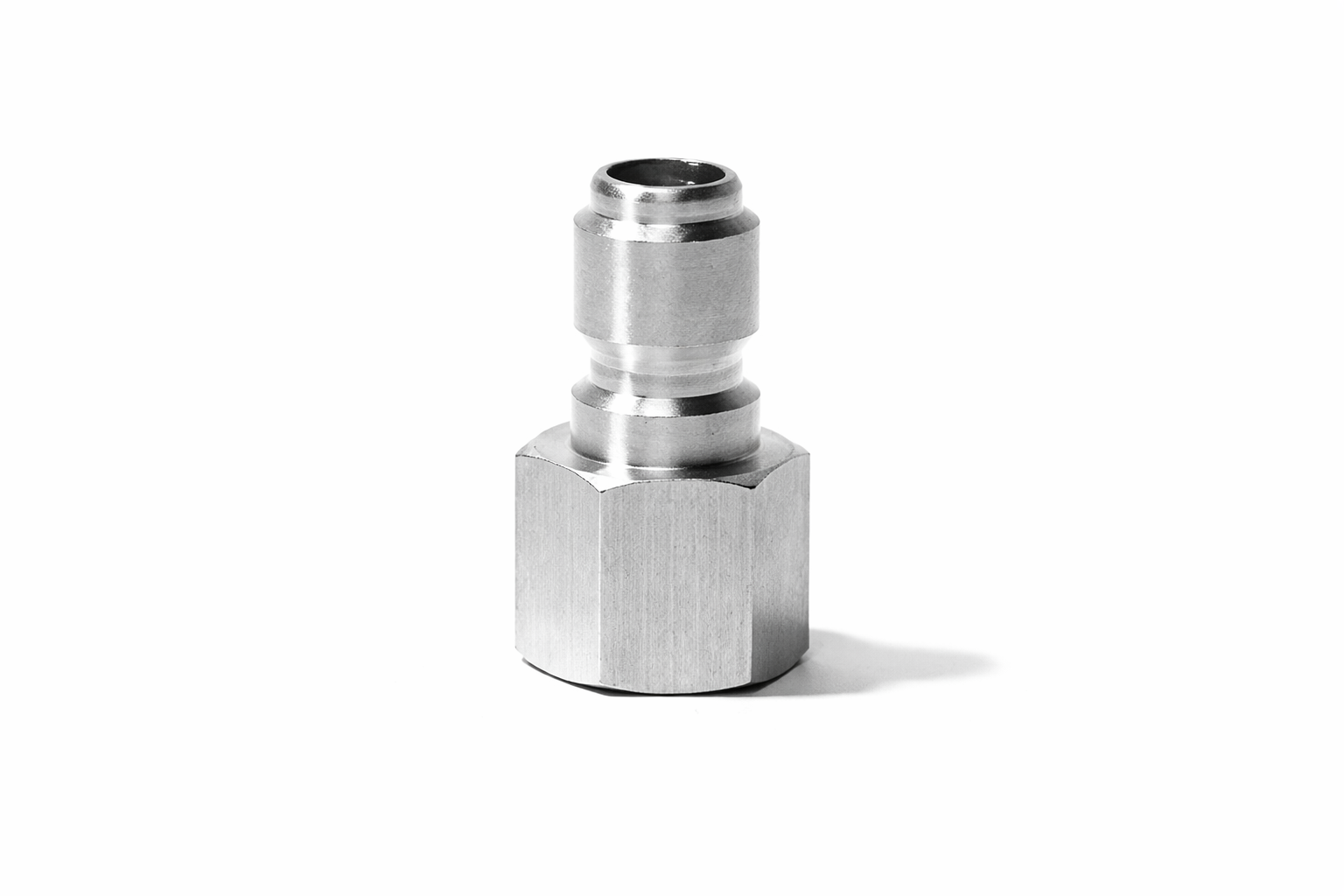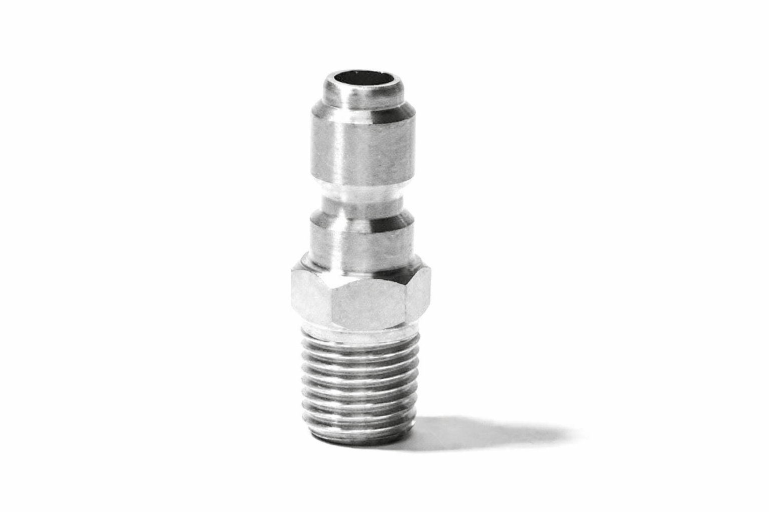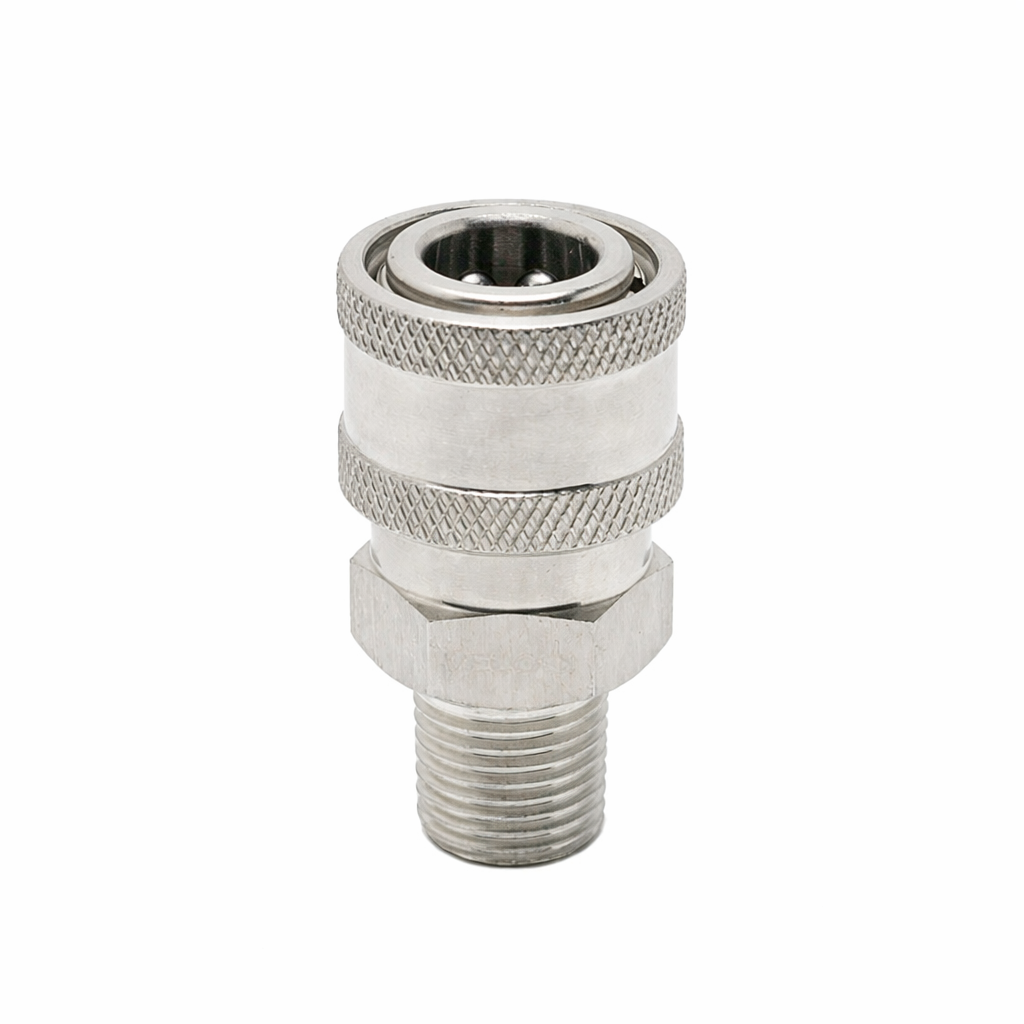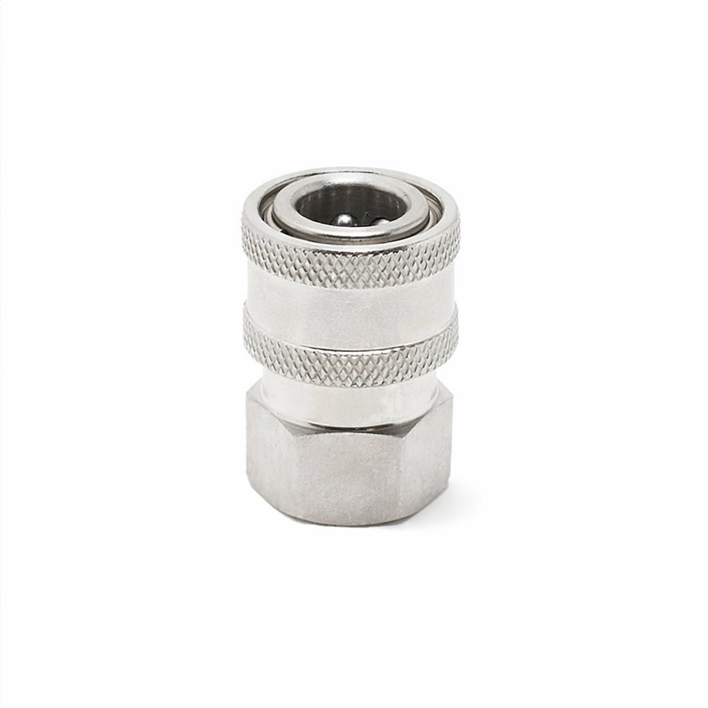 Heavy-duty stainless steel quick connects engineered for high-pressure applications up to 4200 PSI. Features a 3/8" quick connect (QC) connection on one end and a 3/8" pipe thread (NPT) connection on the other end for seamless integration with pressure washer systems to quickly disconnect hose lines, spray guns, or any pressure washing attachments. Variations avaliable.