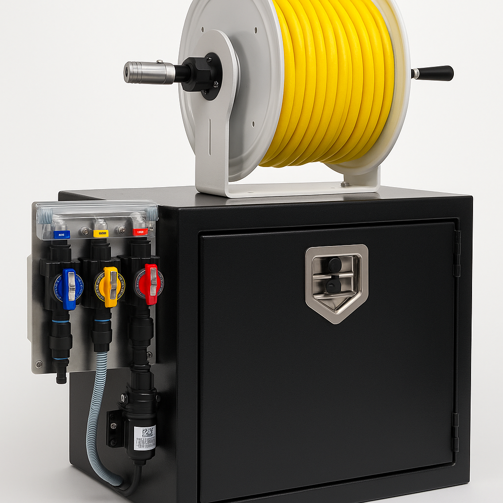 - Mounted hose reel, 200-ft chemical-resistant spray hose, and spray wand or gun