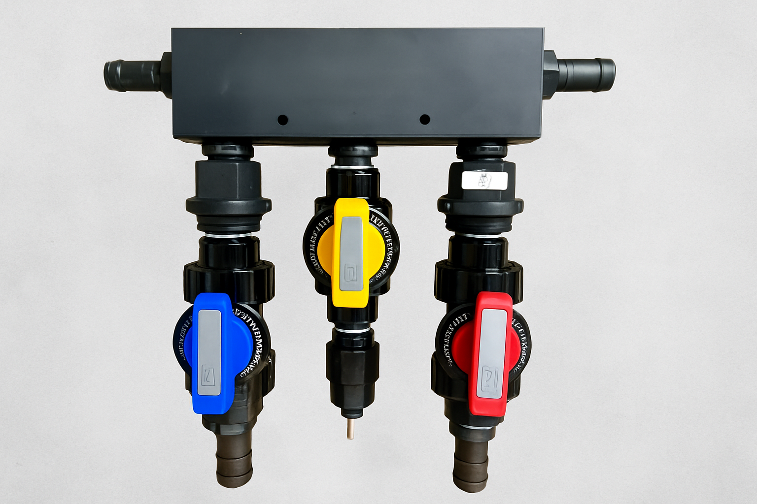 - Heavy-Duty Manifold Block: Corrosion-resistant polypropylene body designed to handle harsh chemical environments. (Also available in clear acrylic)
